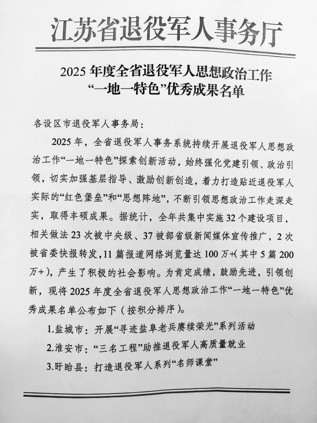 2025年底,江苏省退役军人事务厅公布全省退役军人思想政治工作“一地一特色”优秀成果评选结果。梁溪区“为‘运河古邑’倾注红色基因”项目,从众多参评项目中脱颖而出,位列全省十佳第九名。